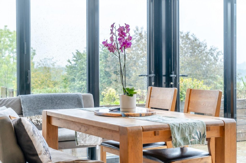 Across the courtyard from the farmhouse is Usk Barn, a charming, detached barn which has been converted to a high specification. Downstairs is a wow open plan lounge and dining area. The lounge area, at one end, is flooded with light from a glazed roof, whilst large floor- to-ceiling windows /doors frame the lovely pastoral views. This part of the room features a modern free-standing log burner. Glazed doors on both sides of the dining area open to outdoor seating and dining areas, which include a private courtyard and a covered area designated for an outdoor hot tub.
