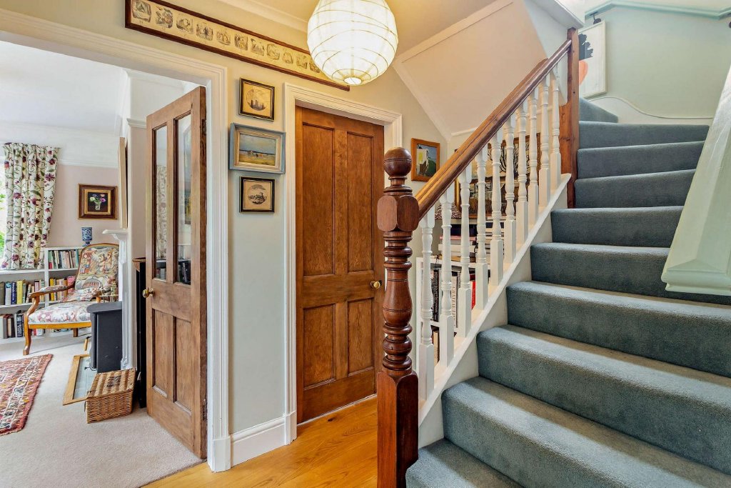 A sitting room, aptly named the snug', with a log burner and beautiful period features such as picture rails, beamed ceiling and an elegant fireplace; small study and a handy WC with plumbing for a washing machine complete the layout of the ground floor.