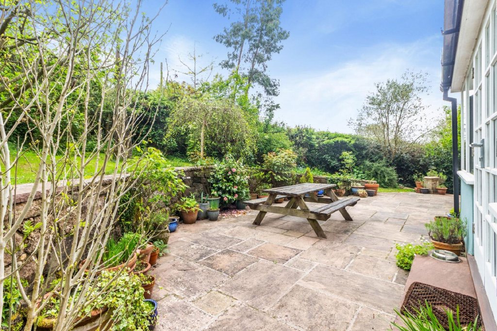 The landscaped gardens include mature trees and shrubs, along with small areas of lawn. A sunken patio lies beyond French doors leading from the kitchen.