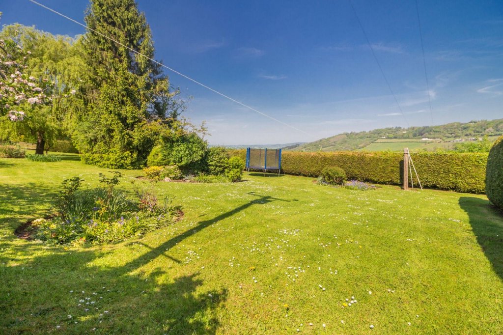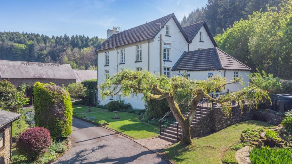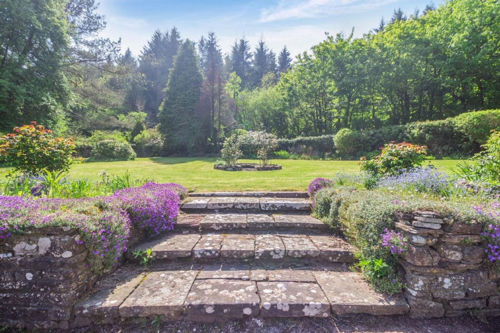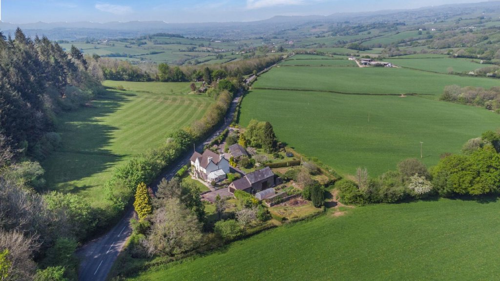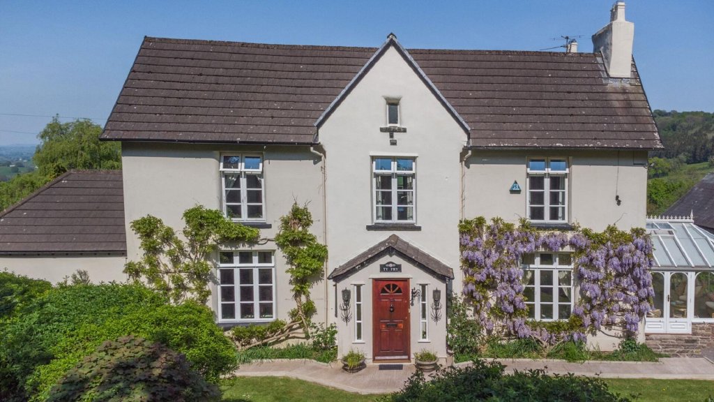 Ty Fry occupies an elevated position and is surrounded by 1.74 acres of mature trees and shrubs and extensive lawns that add to its abiding sense of peace, privacy and serenity. Beyond it lies farm fields and spectacular views of the Brecon Beacons beyond.