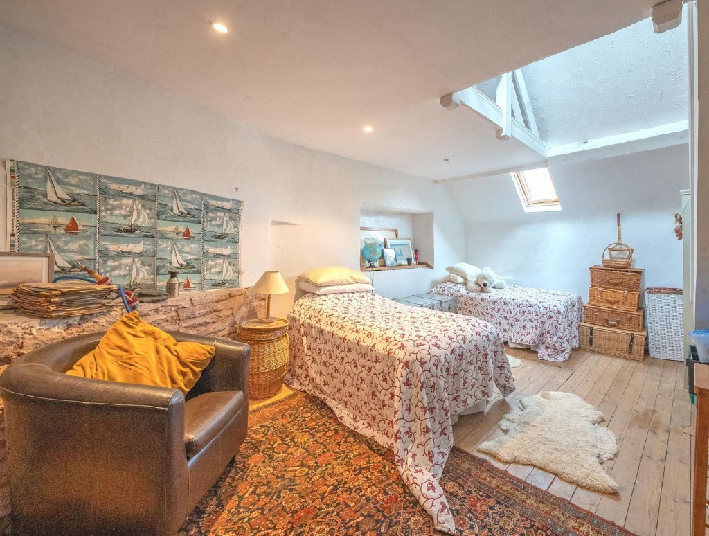 In this part of the house there is also a cosy, dual aspect TV room, with a flagstone floor, a wood burner set in a fireplace with a wood mantel over and a Victorian built-in cupboard to one side.