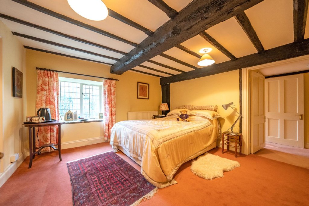 Upstairs, there are two pretty bedrooms in the Victorian wing, one with a similar built-in cupboard and a period fireplace with a cast iron grate. These two rooms share an adjacent shower room. Two further, charming bedrooms, one with exposed beams, share a bathroom. In the Georgian part of the house, two spacious double bedrooms each have an ensuite bathroom. The first floor accommodation also includes a large library with built-in shelving along one wall, a central, exposed beam, a window overlooking the front garden and a fireplace with a cast iron grate. Off the library is a study.