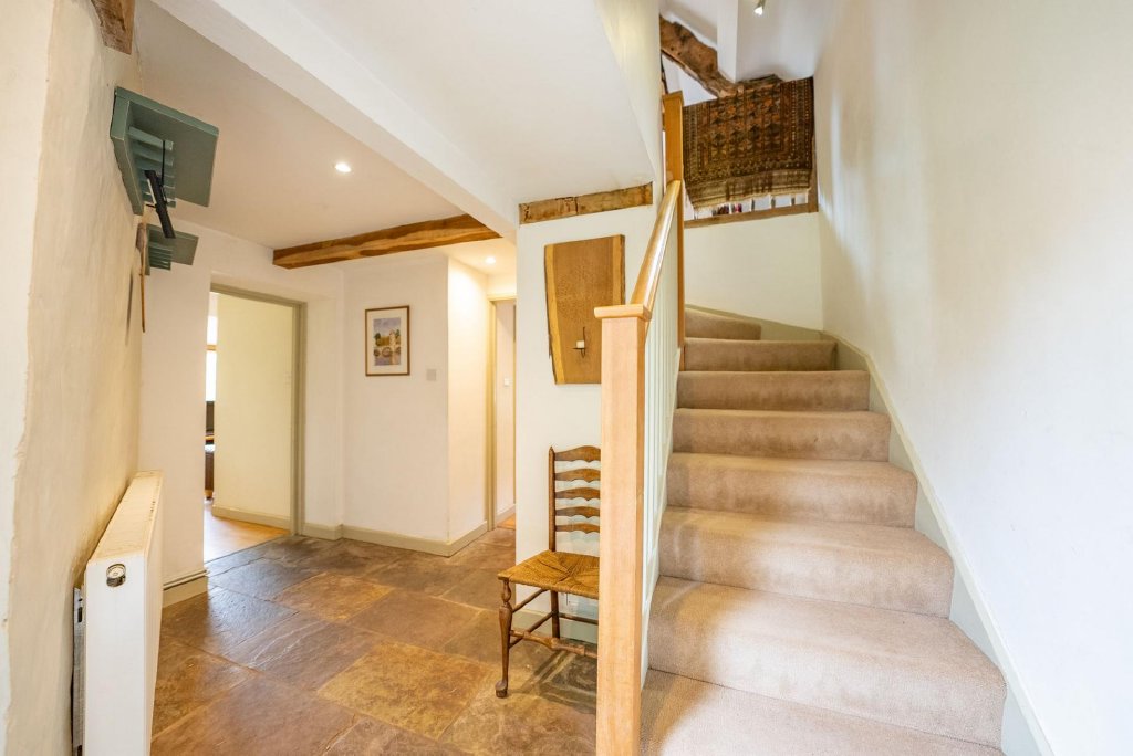 The house is approached along a circular carriage driveway. The attractive facade is almost symmetrical, with large sash windows, French doors onto the garden from the Victorian wing and a central entrance door with a canopied porch and a decorative fanlight over. The front door opens to a large hall which is full of historic character, with flagstone flooring, exposed beams and a beamed fireplace with a log burner. Through an archway, an attractive elliptical staircase leads to the first floor.