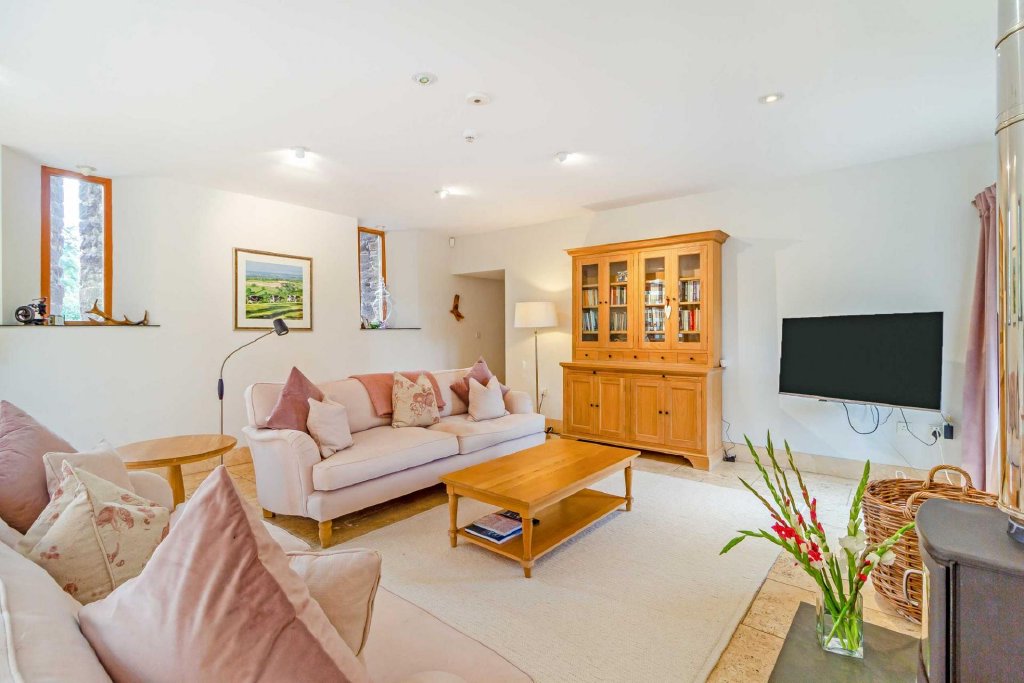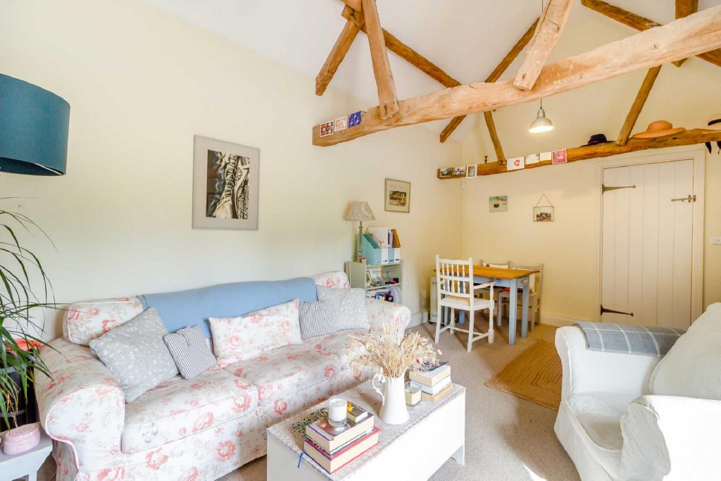A door from the kitchen opens to the former threshing barn, where a spacious living room comprises a cosy seating area in front of a wood burning stove opening up to the centre part of the barn, which soars up to the full height of the building. The former cart doors either side are glazed and on one side they incorporate a glazed door which opens to the courtyard and provides a formal entrance if required. The vendors have made a seating area here, from which they can enjoy views of the garden and countryside beyond.