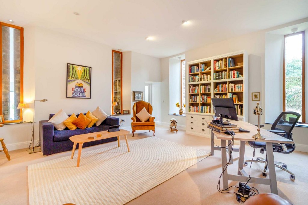 Back downstairs, from the end of the living room three steps lead up to a pair of glazed doors which open to a study, a contemporary-style space yet with the charm of arrow-slit windows with deep slate windowsills. From here a door leads through to a sun room/gym which has glazed doors on two sides which slide open to a patio.