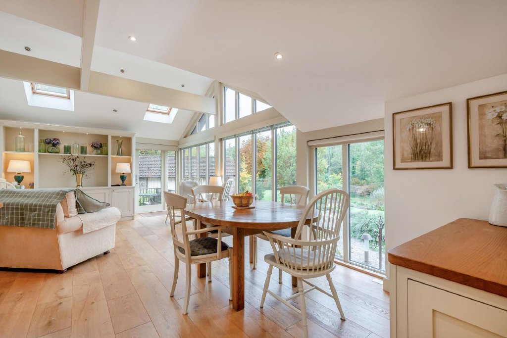 It is a family home with many entertaining options throughout the year. The cottage sitting room is cosy with original features and exposed beams, the main sitting room light and airy. Both have log burners. Gatherings also work extremely well in the open plan kitchen/diner/reception room which overlooks the gardens and woodland.