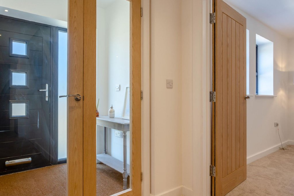 Eco-conscious design meets space and convenience in this brand-new home, awaiting its very first owner. From the moment you step inside, the wow' factor is evident. The entrance porch leads through glazed French doors into a spacious hallway, offering the first glimpse of what lies beyond. Tucked beneath the elegant oak staircase is a useful cloakroom, while engineered oak flooring extends throughout much of this beautifully designed home.