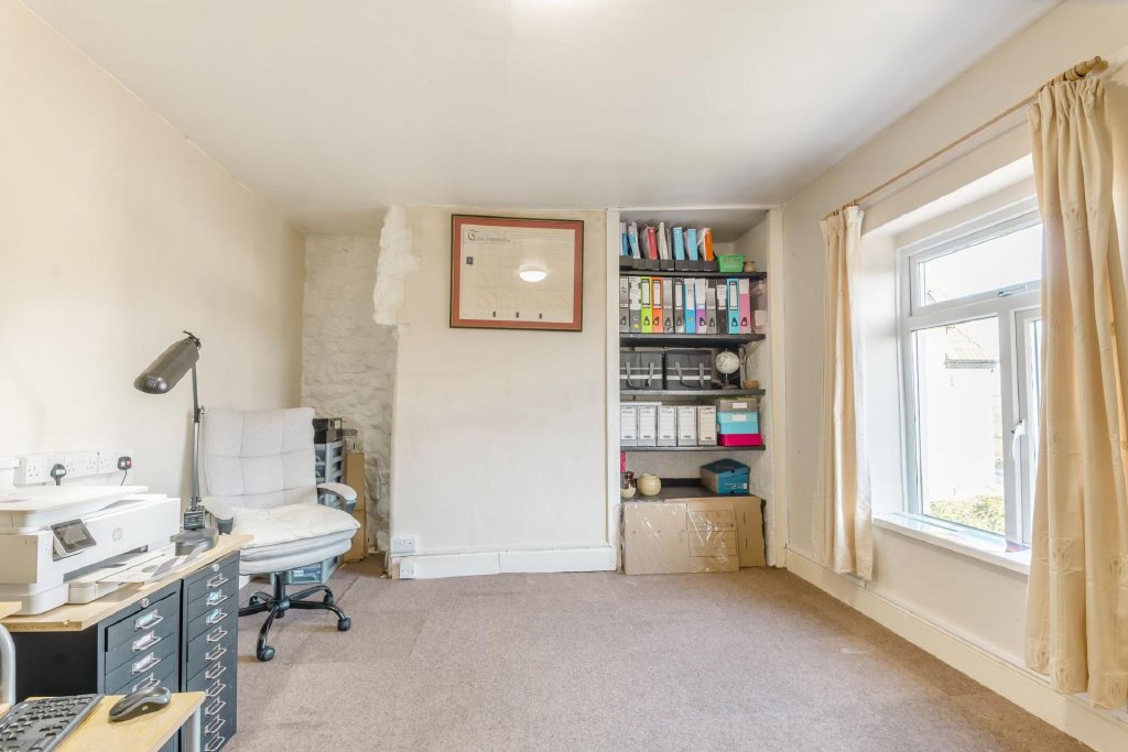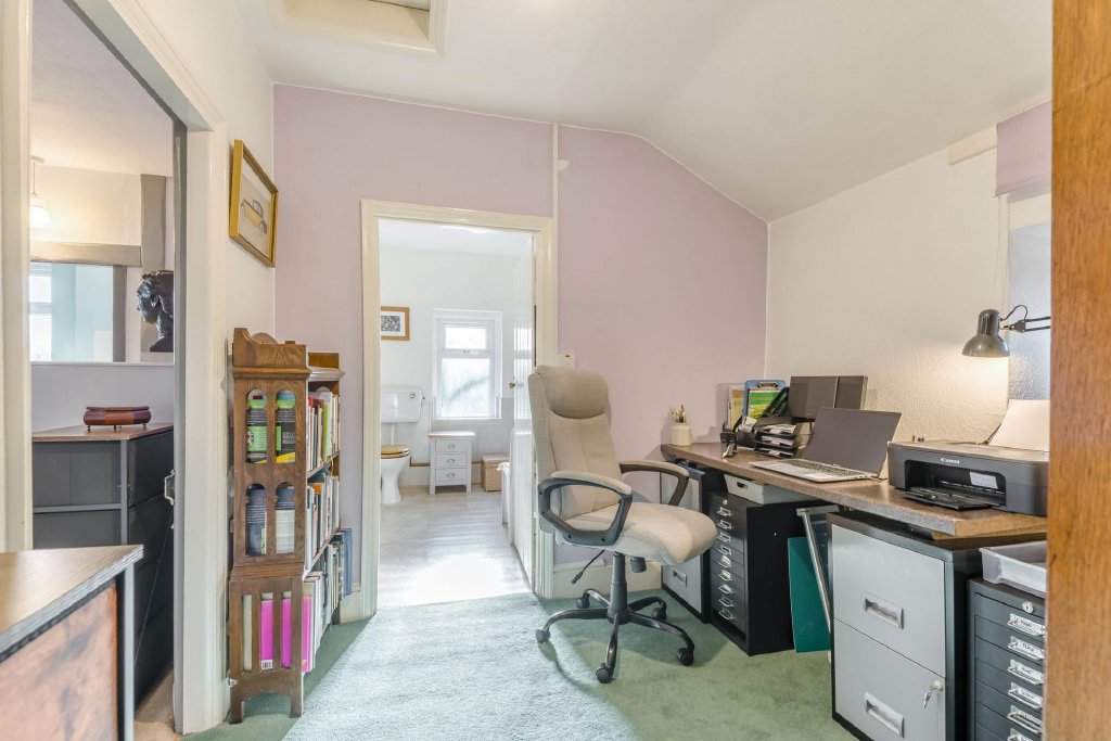 Upstairs, the landing is a notably open area, comfortably accommodating a study space. The principal bedroom benefits from an en-suite shower room, while three further double bedrooms are served by the family bathroom. The bathroom features a white suite, including a walk-in bath by Aquability, with a feature stone wall adding further character and charm.