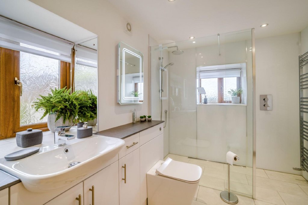 The property benefits from two staircases. The first rises to an open galleried landing overlooking the entrance hall. Here the character of the home is evident, with some low doorways that give way to bedrooms with full head height. On this level are three bedrooms and a beautiful family bathroom, complete with a luxurious Matki shower, ball-and-claw bath, WC, and vanity unit with inset basin.