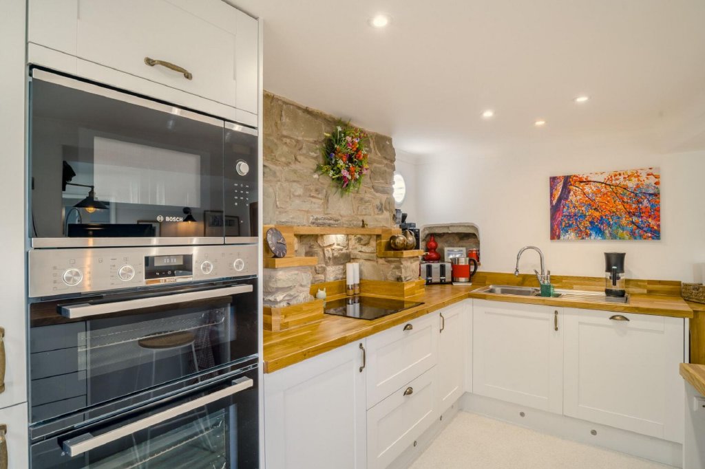 The kitchen, modernised around 2021, is fitted with shaker-style units, solid oak worktops, and a range of integral appliances including a microwave, oven and grill, fridge-freezer, dishwasher, and a Bosch hob cleverly positioned where the original fireplace once stood. This is a wonderfully bright room, enhanced by mirrors set into the window surrounds, which reflect natural light throughout. Plinth lighting adds to the modern feel, and there is ample space for a dining table.