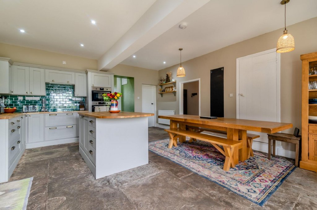There is ample space for a family-sized table and chairs, with glazed French doors offering views of the garden. A door from the kitchen leads to a cellar, which is also accessible from outside.