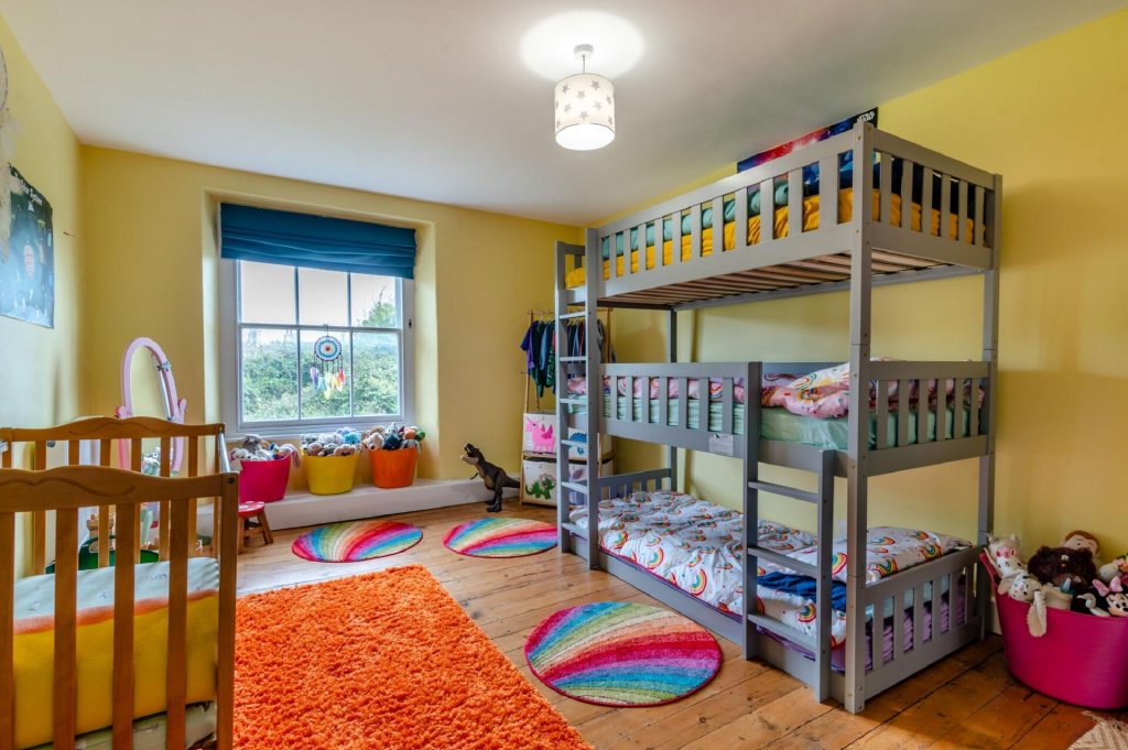 The staircase ascends to an impressive landing with vaulted ceilings and Velux-style windows that flood the space with light. A window at the end of the landing frames a beautiful view of the garden and surrounding land. The first floor comprises five double bedrooms, with the principal bedroom featuring an en-suite cloakroom. The family bathroom was newly installed at the end of 2023.