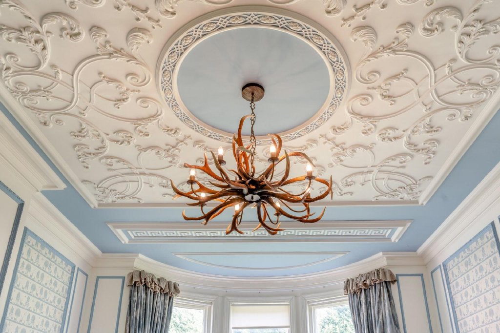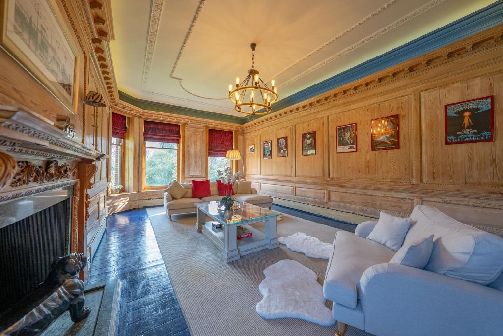 Upon entering, the grand reception hall welcomes guests with exposed oak flooring, a magnificent stone fireplace, and a stunning oak cantilevered staircase with turned balustrades. The drawing room and sitting room, located at the southern end of the house, are richly adorned with ornate plaster ceilings, timber panelling, and large windows that offer commanding views of the surrounding gardens and parkland.