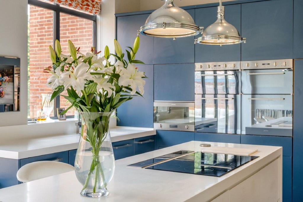 The formal dining room, centrally positioned within the house, boasts a curved bay window, ornate plasterwork, and a classic fireplace, creating an elegant setting for entertaining. Adjacent to the dining room is the guest cloakroom and access to the practical cellars below. The contemporary kitchen and breakfast room, located at the north end, feature custom cabinetry by Woodgrayne Interiors and integrated appliances by SMEG. A central island with a unique illuminated resin feature and bifold doors leading to the pool area enhance this space as the heart of the home.