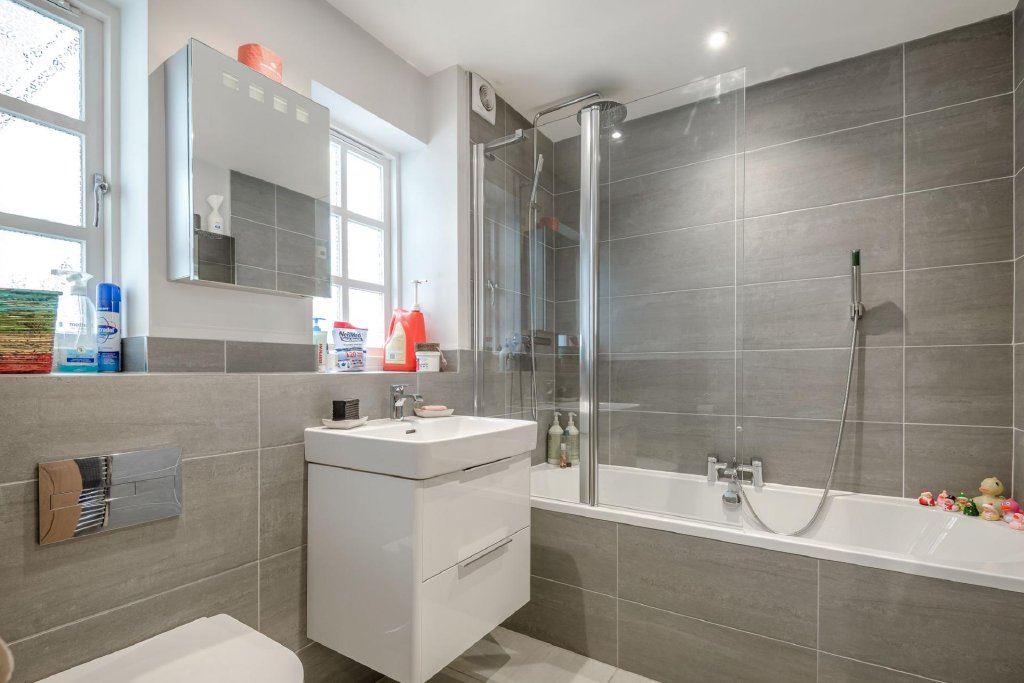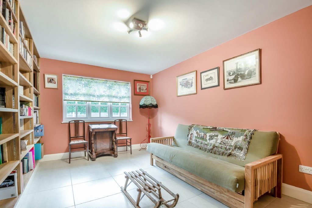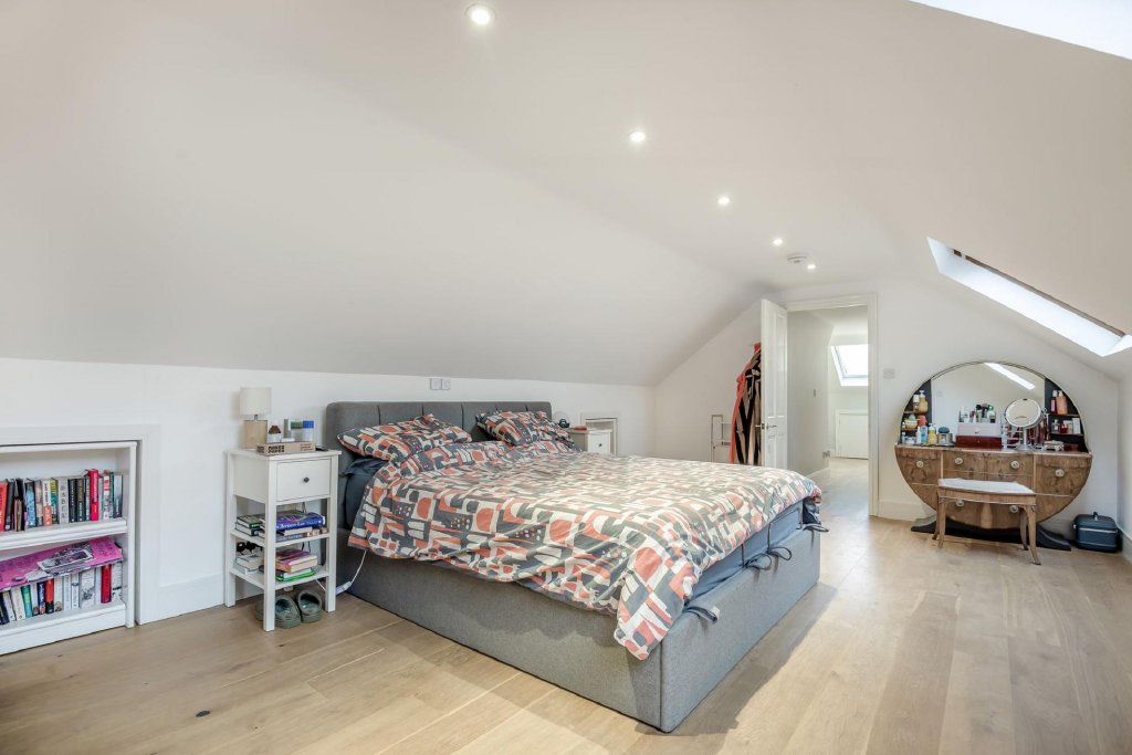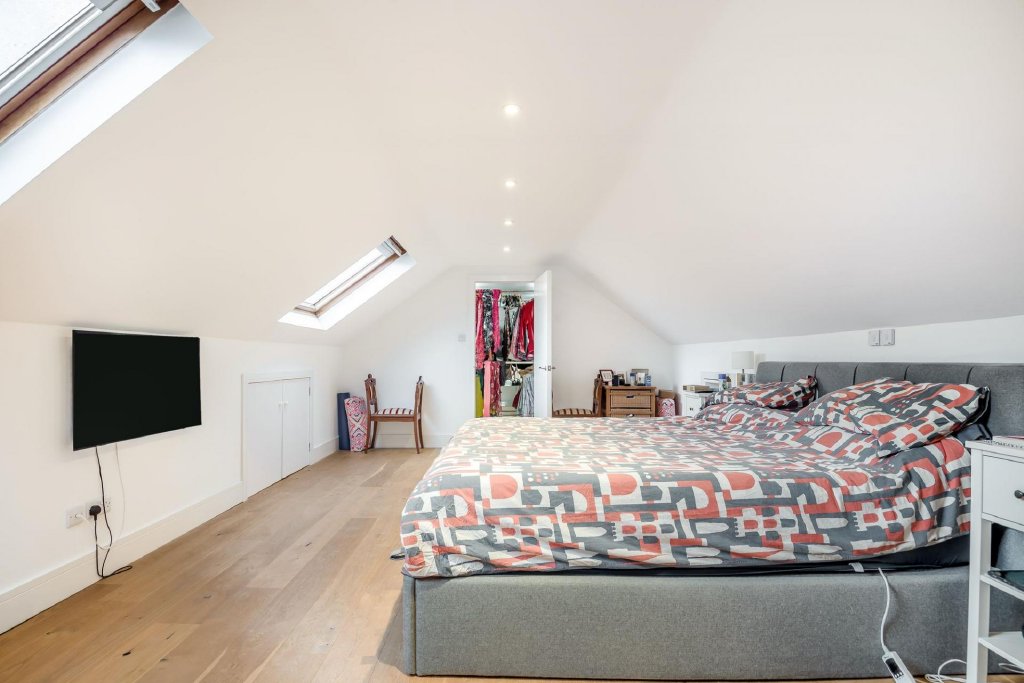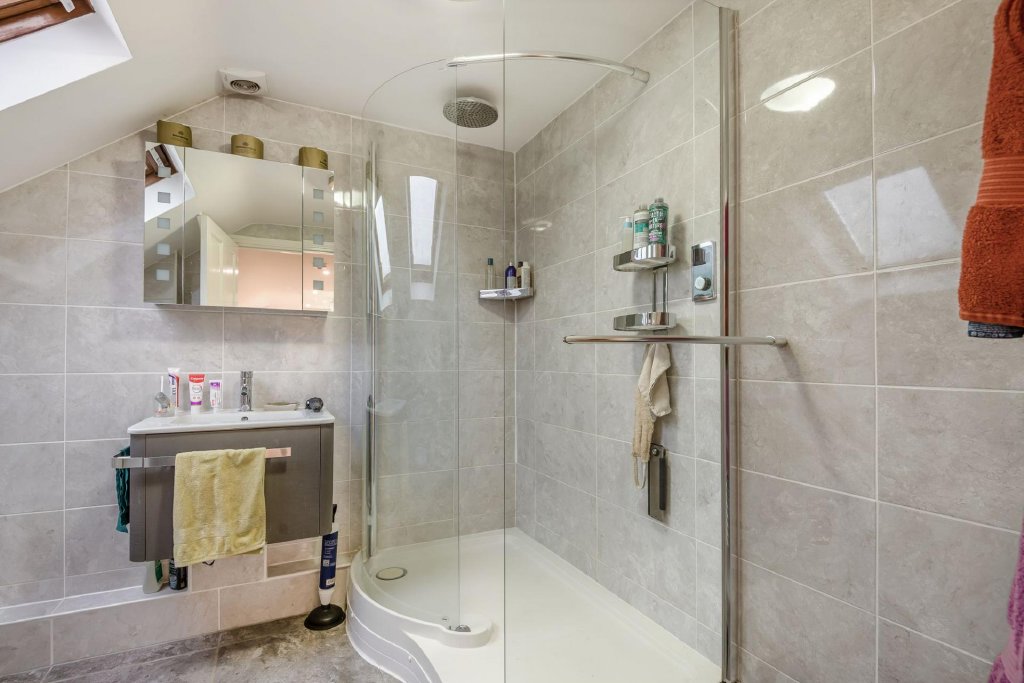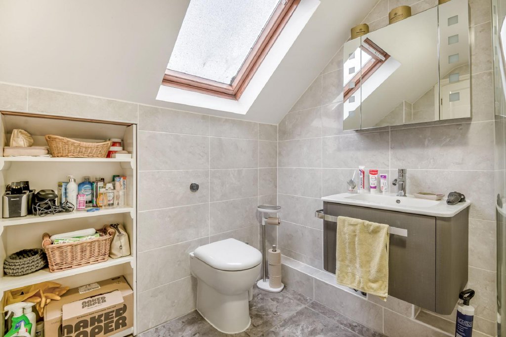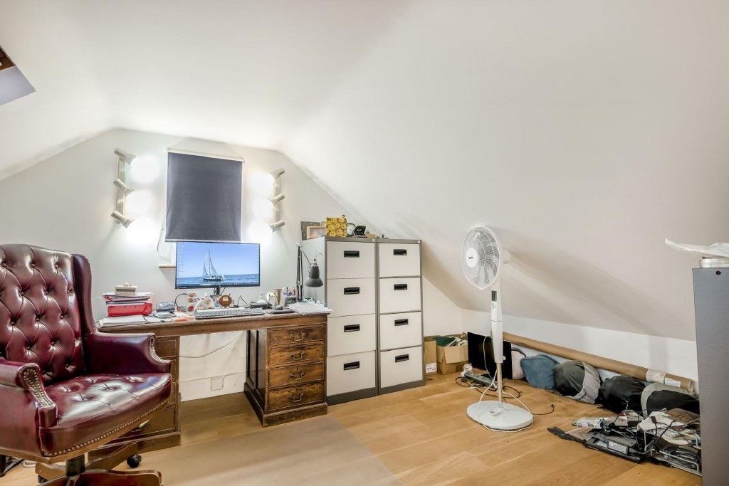 There are two bedrooms to the first floor, the largest of which is particularly generous in size, with a large walk in dressing room to the far end, Velux windows to rear aspect and storage access in the eaves. The second bedroom is currently in use as a home office.