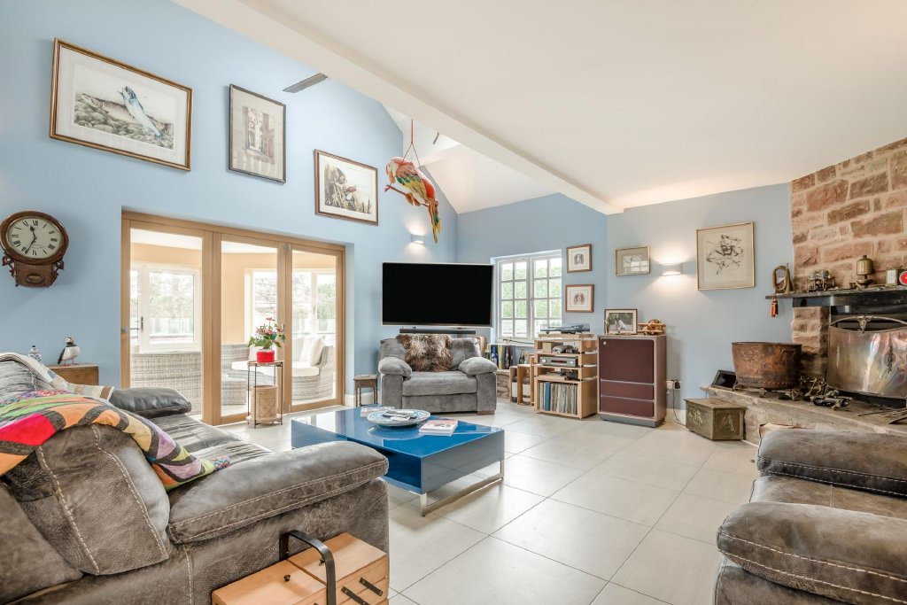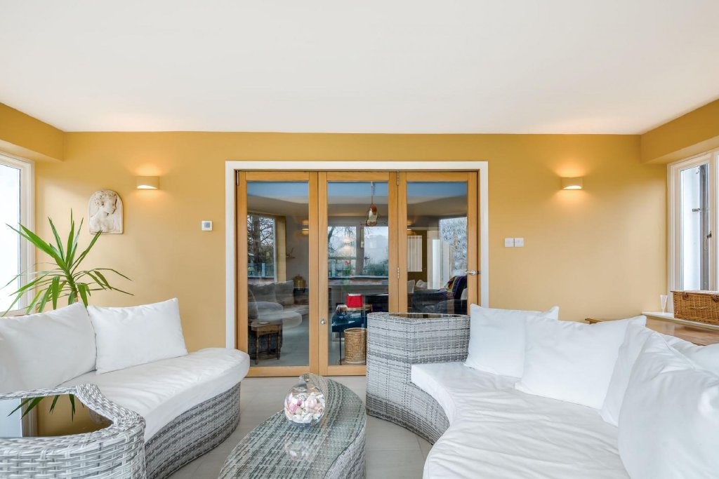 Leading straight ahead, glazed double doors bring you into a beautiful living room, with part vaulted ceiling and a mezzanine area overlooking above. There is a woodburning stove to one corner with a brick surround and bifold glazed doors leading into a wonderful sun room overlooking the gardens.