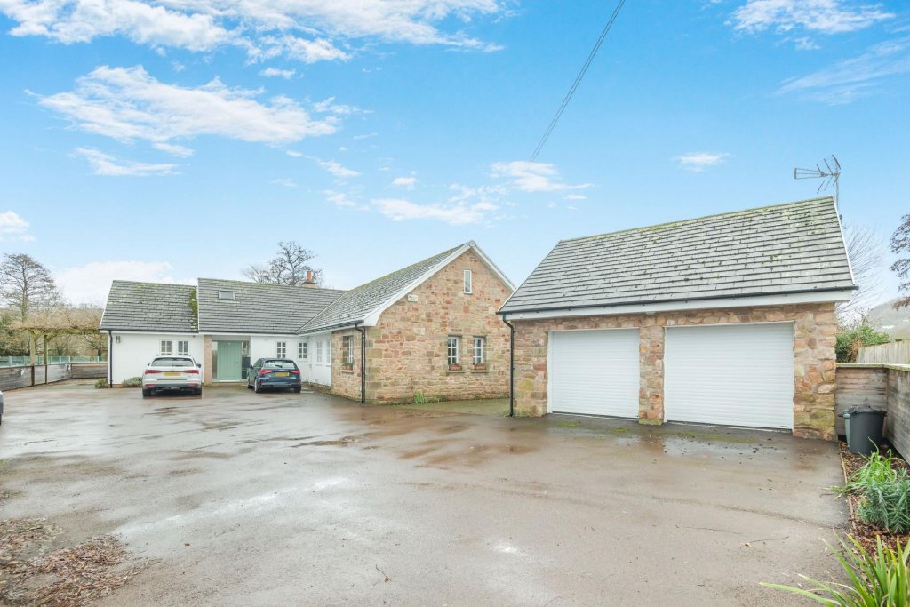 A driveway leads to the front of the property, where ample parking can be found, alongside access to a detached double garage, featuring electric roller doors and a studio room above, ideal for a home office or simply additional storage space.
