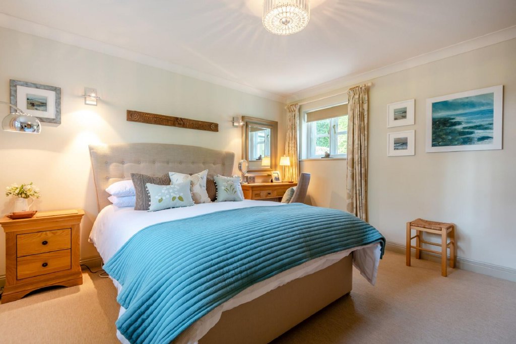 A staircase leads from the entrance hall to the first floor landing, which is in itself a lovely bright, open space with wonderful panoramic views and plenty of storage space with numerous in built cupboards.