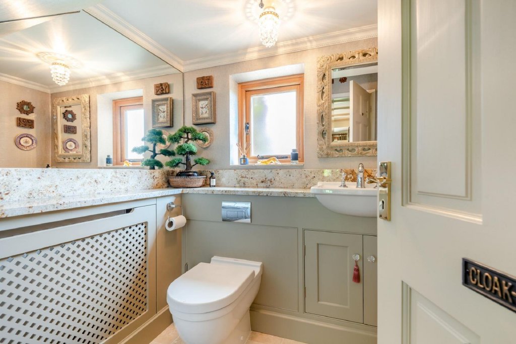 Further to the hallway is a cloakroom with W.C, wash basin and granite worktop, as well as a home office with space for a desk and storage.