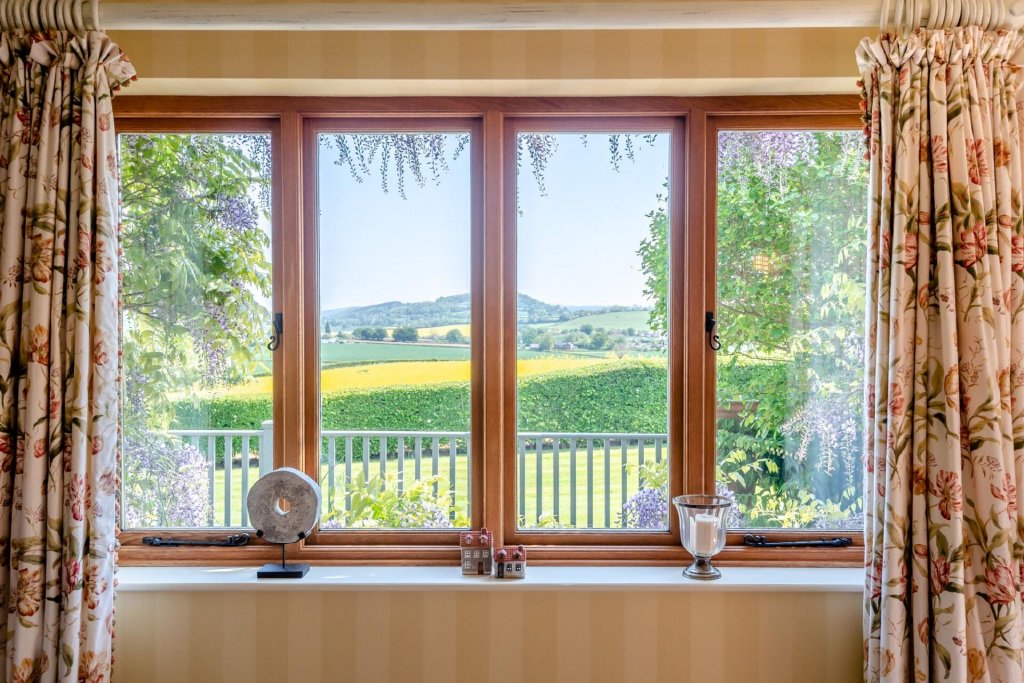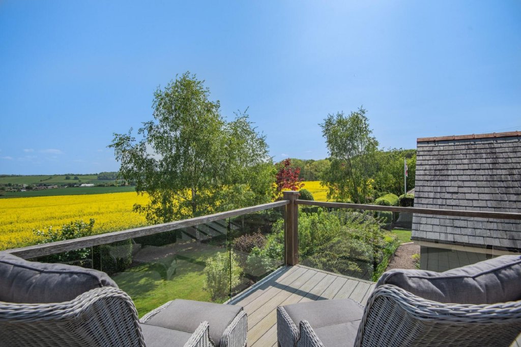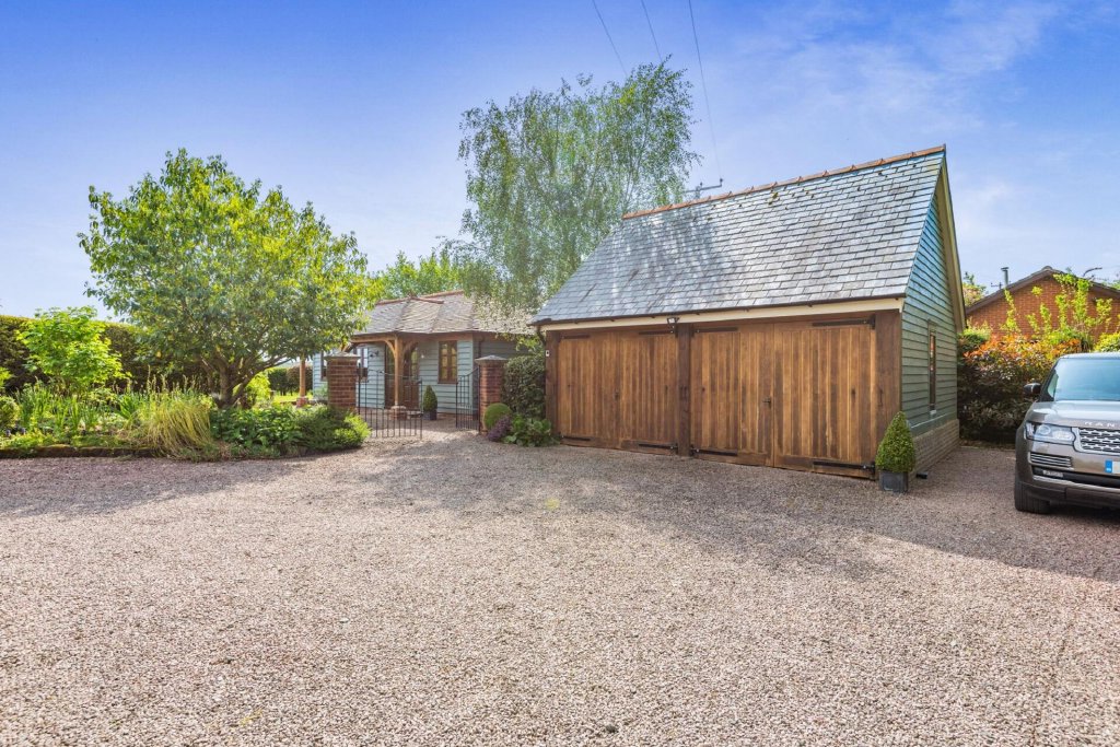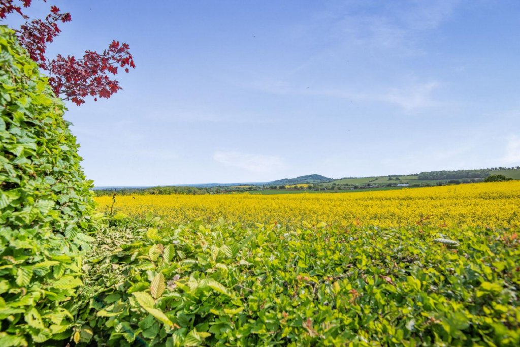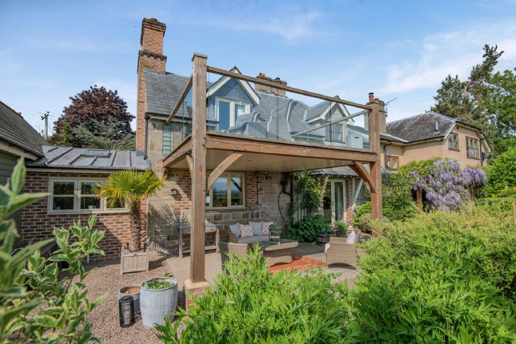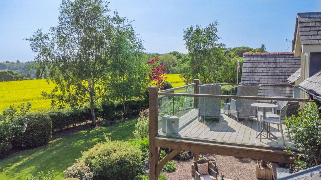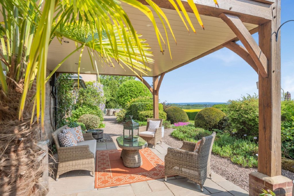To the rear of the house is a particularly special area, with a large paved patio and a decking area, placed strategically to make the most of the east facing views over fields of yellow and green towards Dinedor Hill and as far as the Malvern Hills.