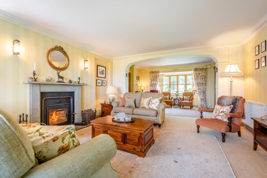 Turning left off the entrance hall is a generous and beautifully presented drawing room, with windows to front and rear aspect allowing light to fill the room. There is an inset woodburning stove, French doors leading out to the rear patio and a lovely view over fields to the rear.