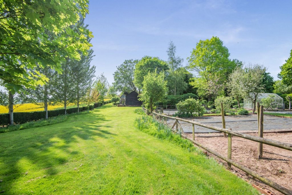 Further along from the house, a gate leads into a glade with mature trees, which leads down to a fantastic enclosed kitchen garden, with enough large established beds and a greenhouse to allow for a degree of (if not total) self-sufficiency.