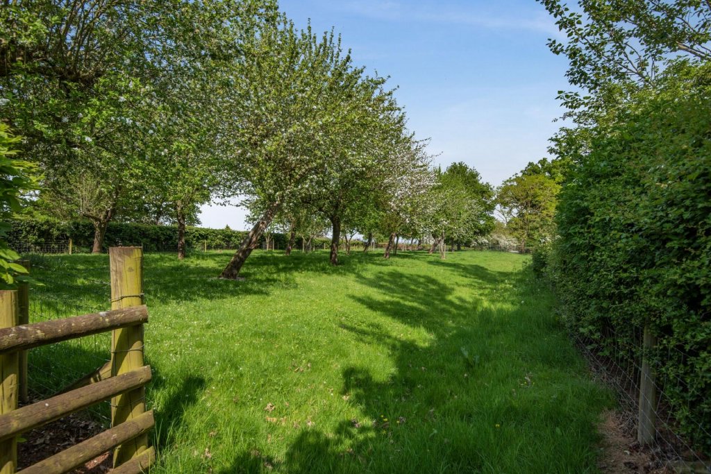 Continuing form here you enter a lovely orchard with a range of fruit trees, and several acres of paddock ideal for grazing or for transformation into a wildflower meadow.