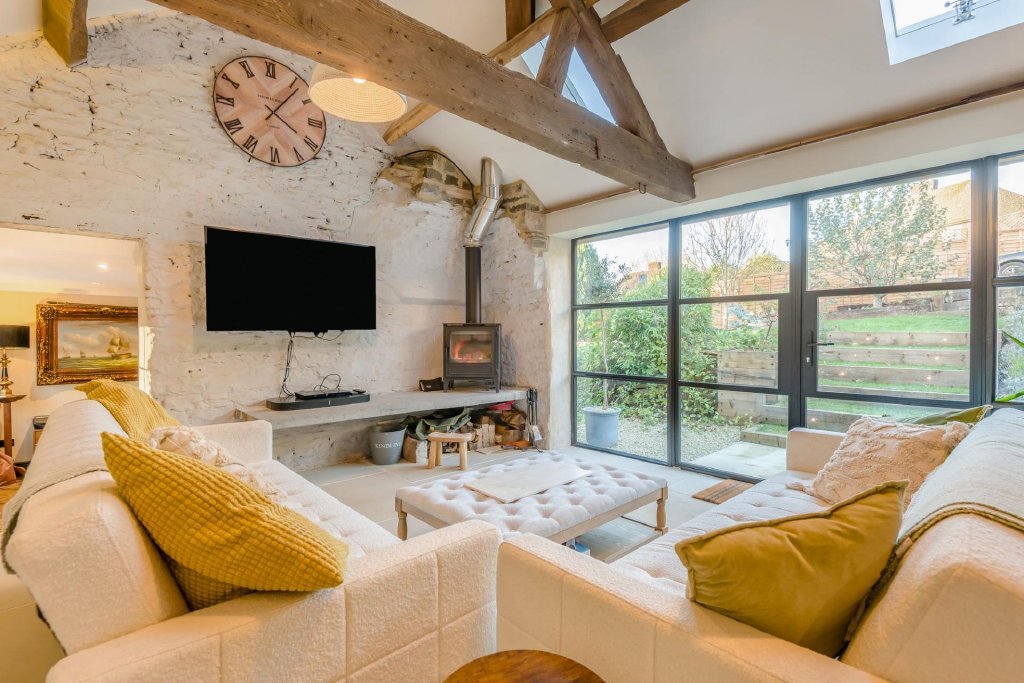 A small set of steps leads up to a beautifully cosy living room with whitewashed stone walls, vaulted ceiling with exposed beams and cast metal frame rooflights and a woodburning stove elevated from the floor level. There is underfloor heating and a pair of glazed double doors leading out to the rear garden.