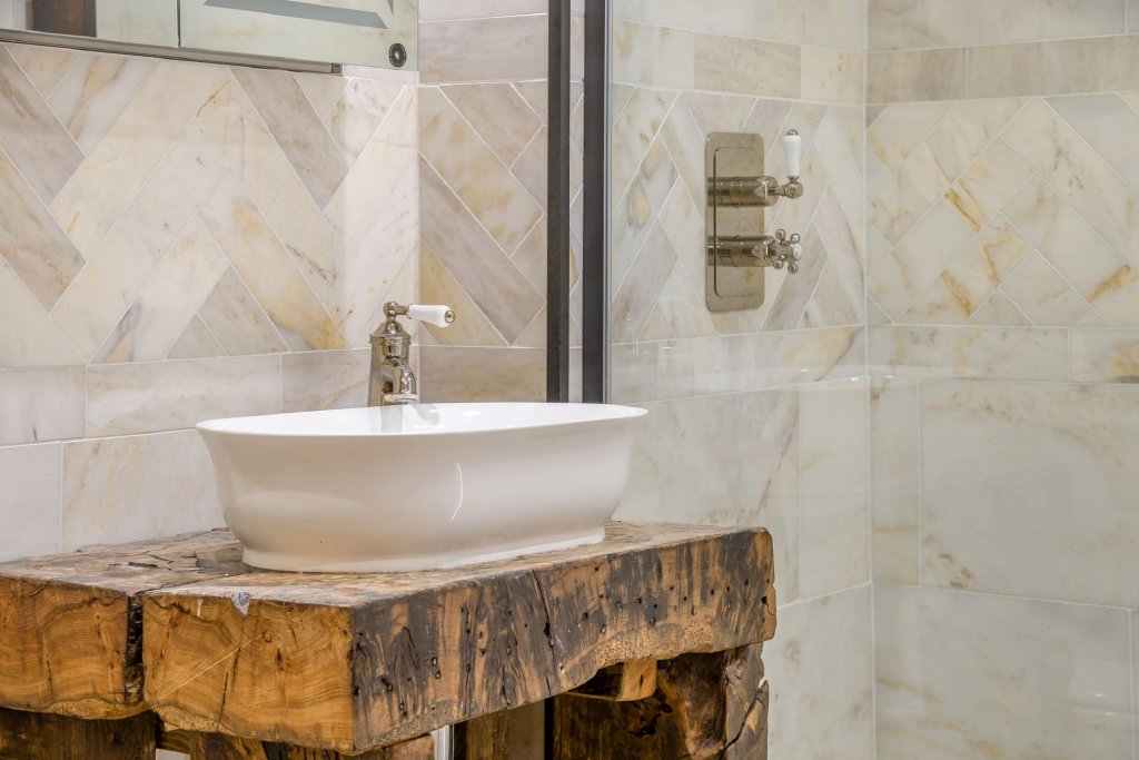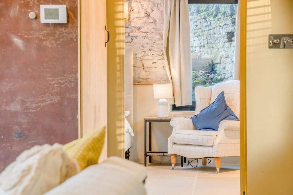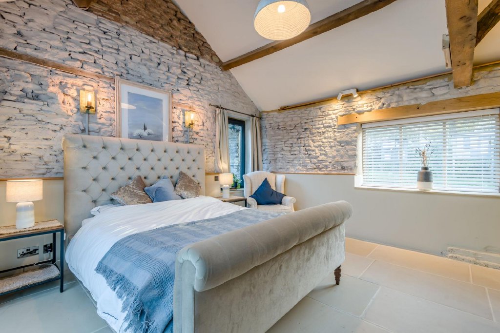 Just off the living room is the principal bedroom suite, which boasts exposed stonework and beams to the vaulted ceiling, glazed doors leading outside, fitted wardrobes to one wall and a beautifully appointed en-suite with walk in shower with Calcutta marble tiles, a vanity unit with hand basin and w.c.