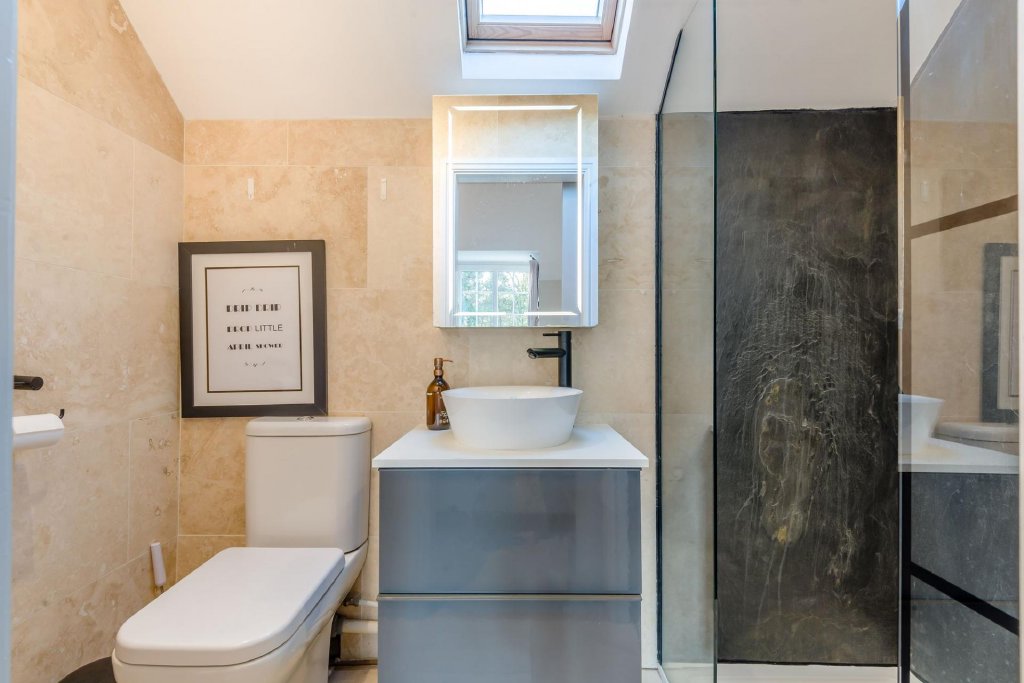 The largest of the first floor bedrooms enjoys a vaulted ceiling with exposed beam, built in wardrobe and a sliding door leading into a very tastefully finished en-suite, complete with with walk in shower, vanity unit with hand basin and w.c.