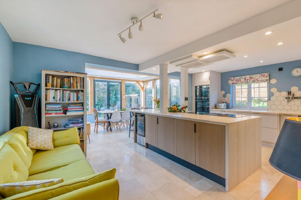 Turning left from the hallway, you enter what is perhaps the most impressive room of the house; a superb open plan kitchen-dining room, which has been added to with a stunning oak framed orangery which opens directly onto the sun terrace outside and allows light to flood the room with its atrium style skylight.