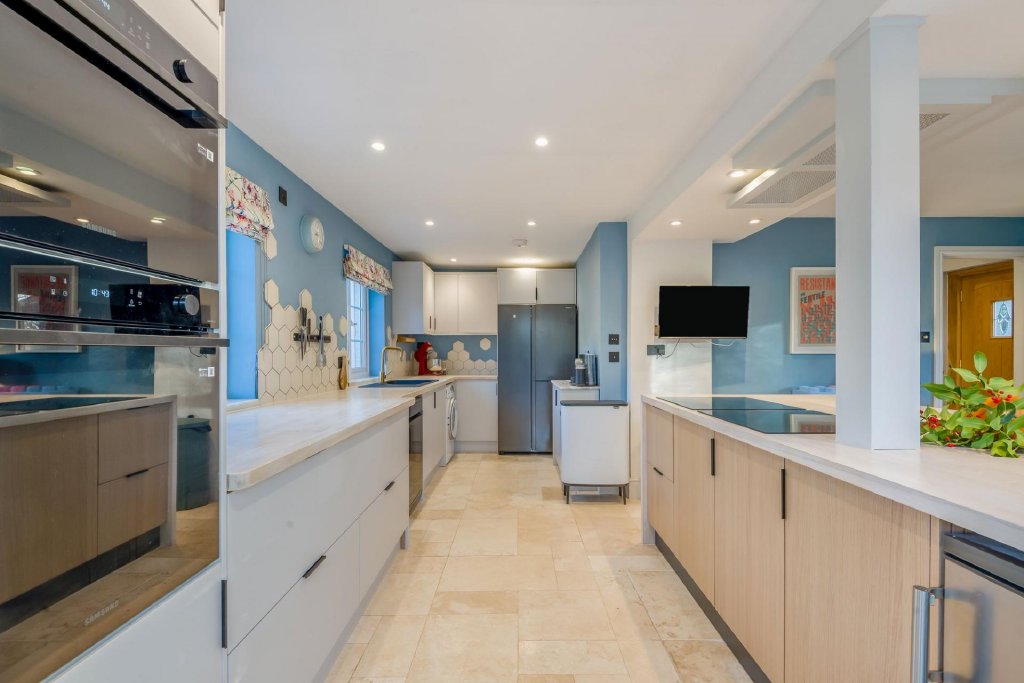 The kitchen itself is bespoke and extremely tasteful, with a contemporary aesthetic that enhances the rustic charm of the property. There are a range of floor and wall mounted units, two built in, eye-level Samsung smart combi-ovens, large central island unit with two Zanussi induction hobs and bespoke extraction canopy over, and a sink with drainer.
