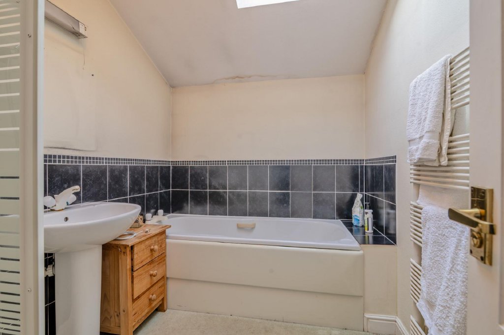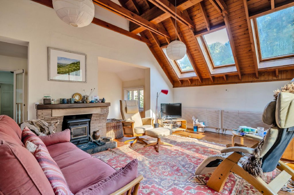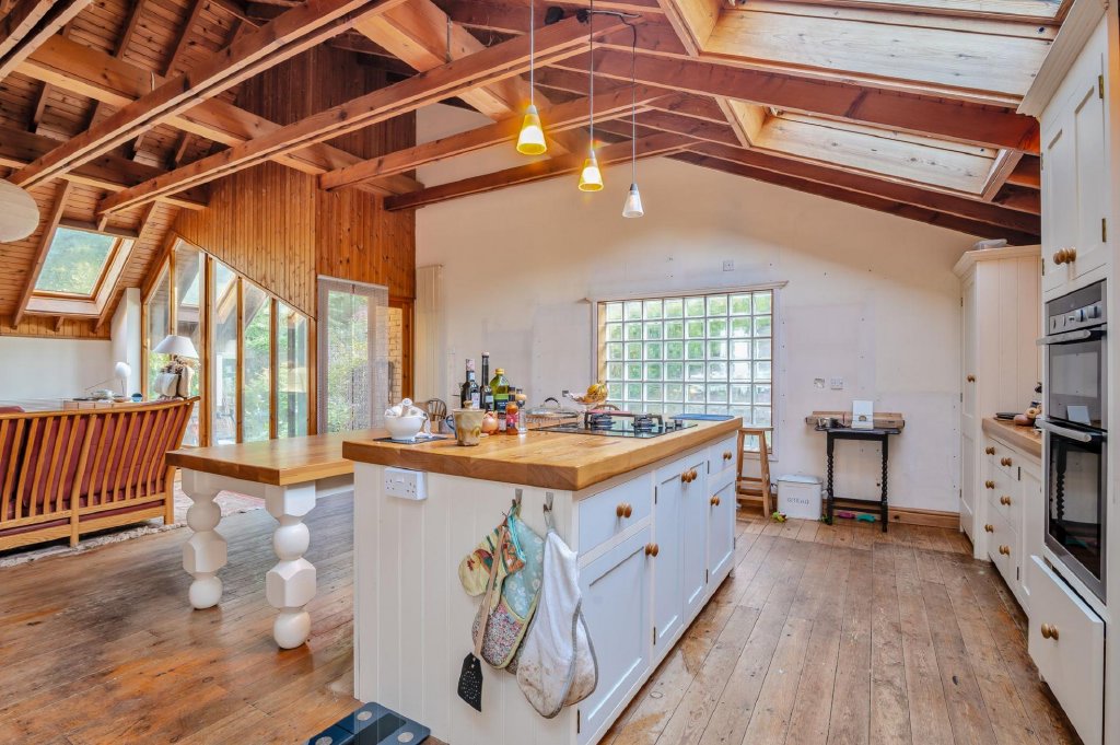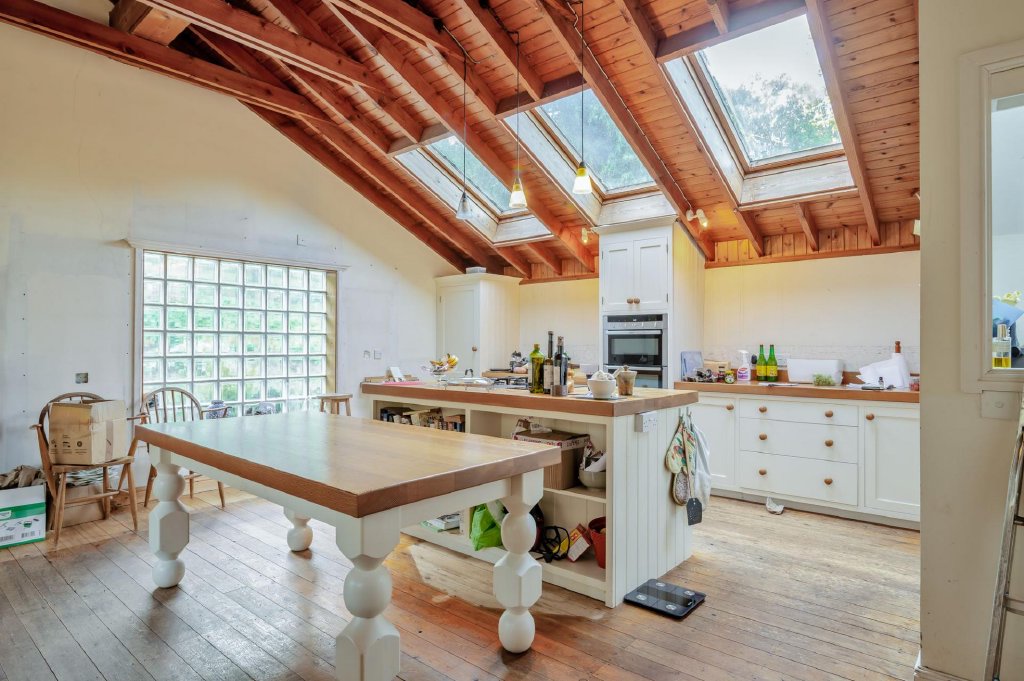 The living space flows directly into the kitchen-breakfast area in an open plan design, and triple Velux windows allowing light to flood the area. The kitchen was replaced by the current owners, with modern units, a central island and fitted electric oven.