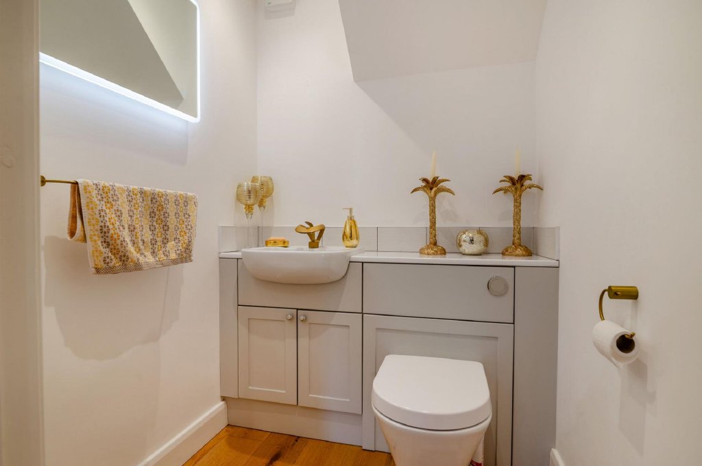 This beautifully appointed and spacious home has been finished to an exceptional standard throughout, thoughtfully designed for modern living. From the moment you step into the welcoming entrance hallcomplete with solid oak flooring, recessed LED lighting, and elegant oak banisteryou are met with a sense of style and quality that continues throughout the property. A sleek downstairs WC with contemporary vanity unit and steam-proof LED mirror adds practicality with flair.
