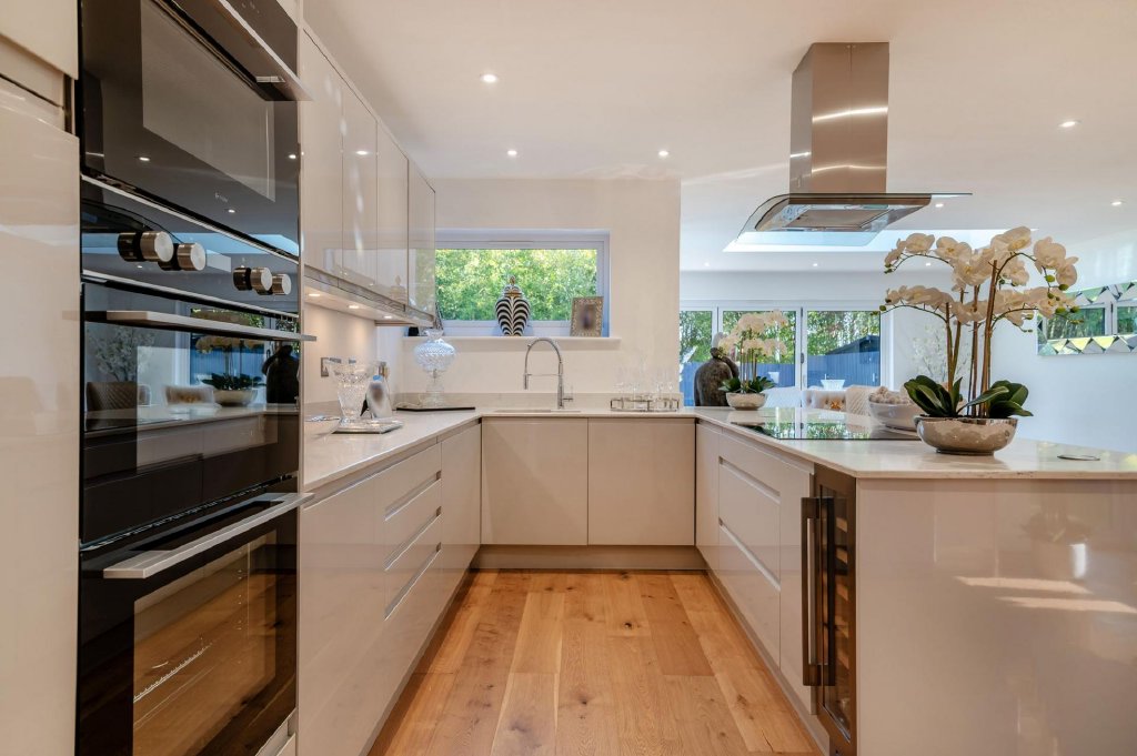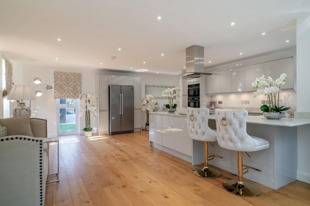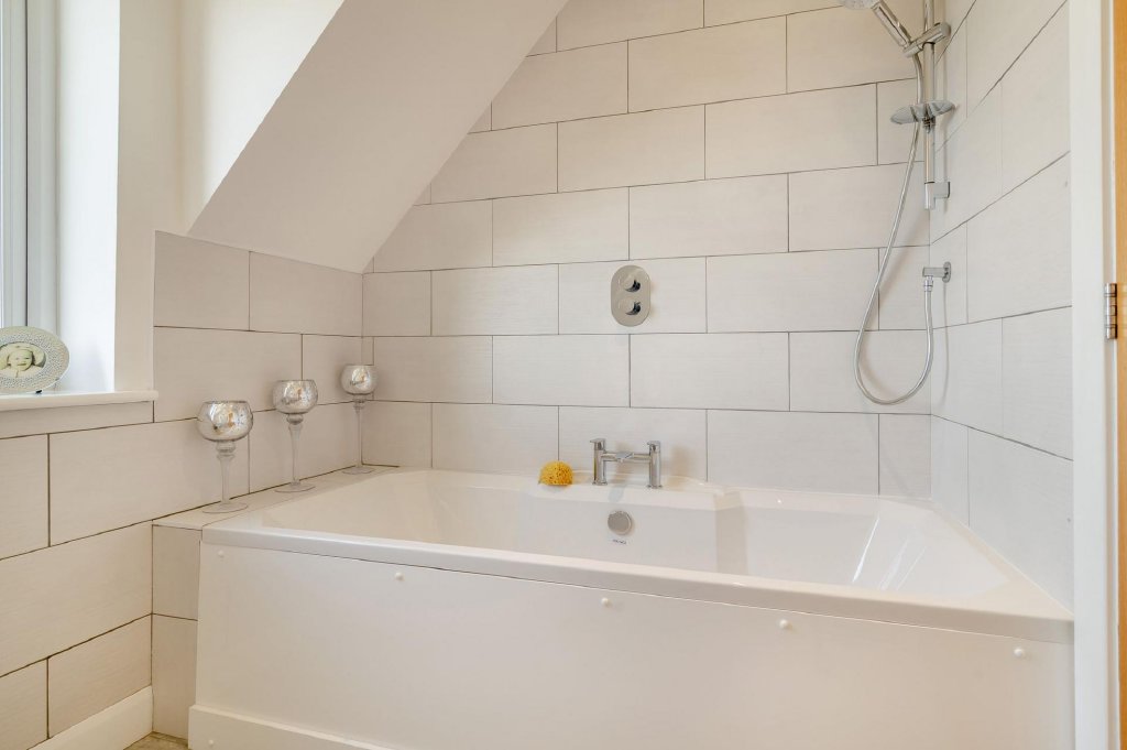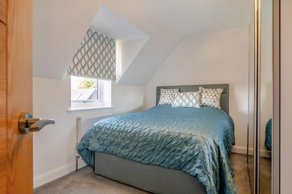Upstairs, a bright landing with glass balustrade and striking feature light leads to four beautifully presented bedrooms. The principal suite is a luxurious sanctuary, complete with bespoke wardrobes, skylight windows, and a chic ensuite shower room. Two further generous doubles offer ample storage and style, while a fourth bedroom makes an ideal nursery or home office. The contemporary family bathroom is finished to a high standard with a rain head shower over the bath, vanity storage, and heated towel rail.