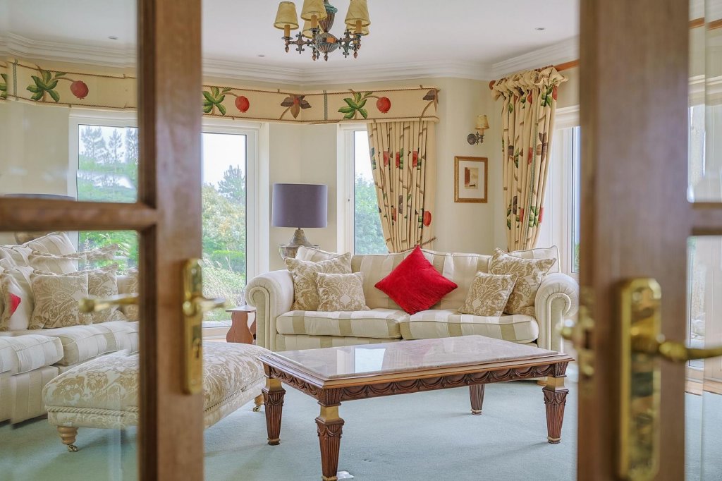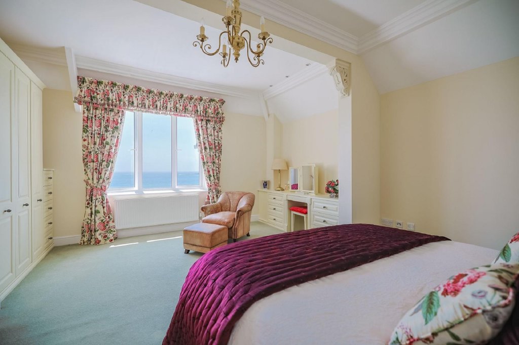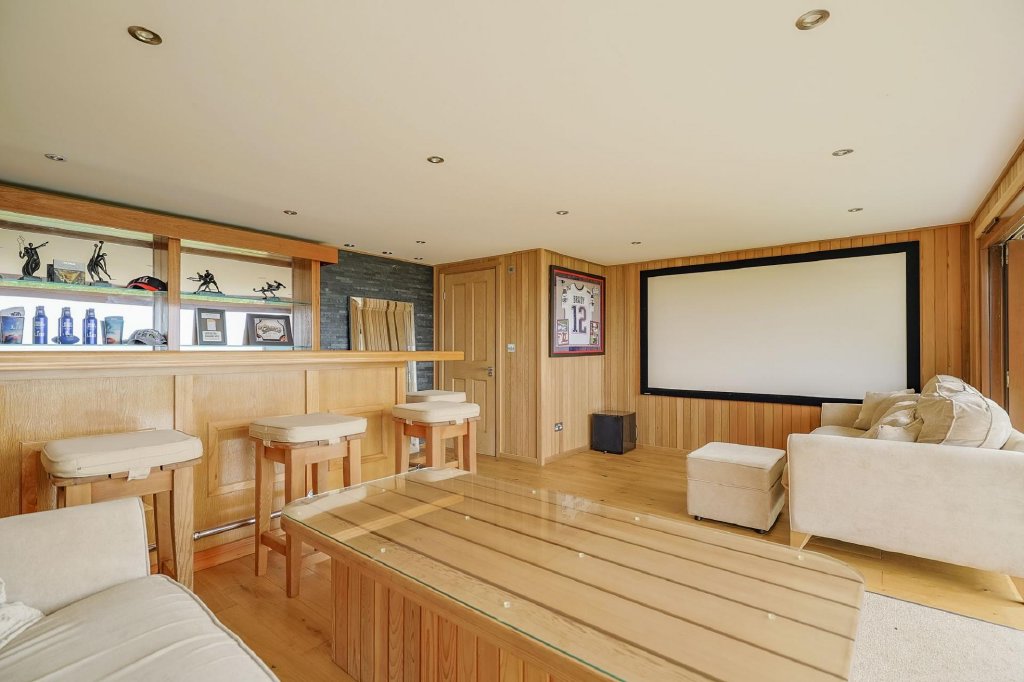 Within the grounds sits a remarkable cedar-clad garden room, a luxurious space that includes a cinema room, full bar, underfloor heating, sound system, WC, and spotlighting. Bi-folding doors open outwards, allowing you to sit back and soak in the coastal surroundings and the soothing sounds of the sea.
