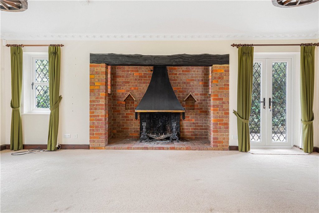 Large reception hall with galleried landing and cloakroom off. Well balanced large drawing room central comprising an Inglenook style fireplace with fire basket and hood, French doors to garden.