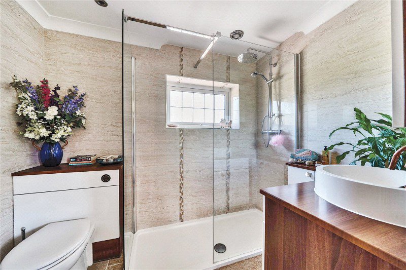 Walk in shower with shower attachment, vanity wash hand basin with mono taps over, wall mounted storage cupboard, low level WC, wall mounted ladder style radiator, tiling in part to all walls, Italian porcelain tiled flooring.