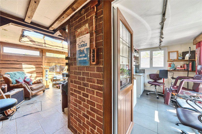 Double glazed windows to the front and side, Clearview wood burning stove ceiling spotlight points, Italian porcelain flooring, power points.