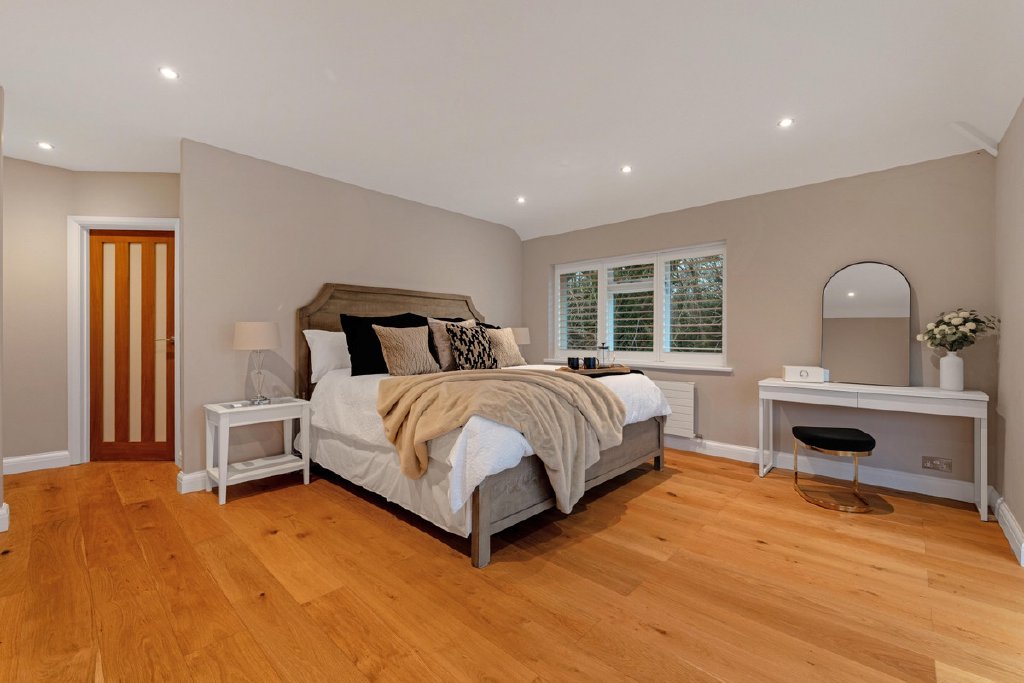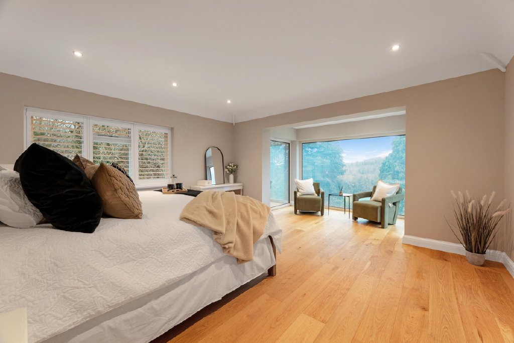 Upstairs, the principal suite occupies a commanding position with panoramic countryside views framed by switchable floor to ceiling smart glass windows. The suite incorporates a generous dressing room and a contemporary en suite shower room with underfloor heating.