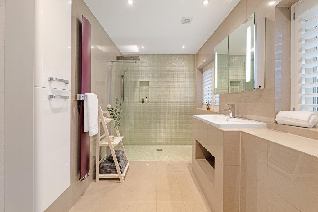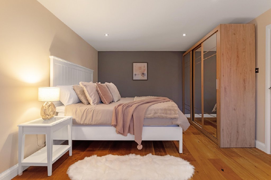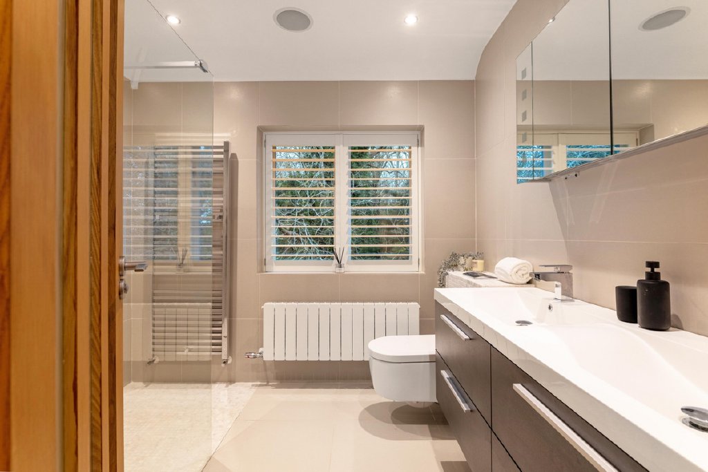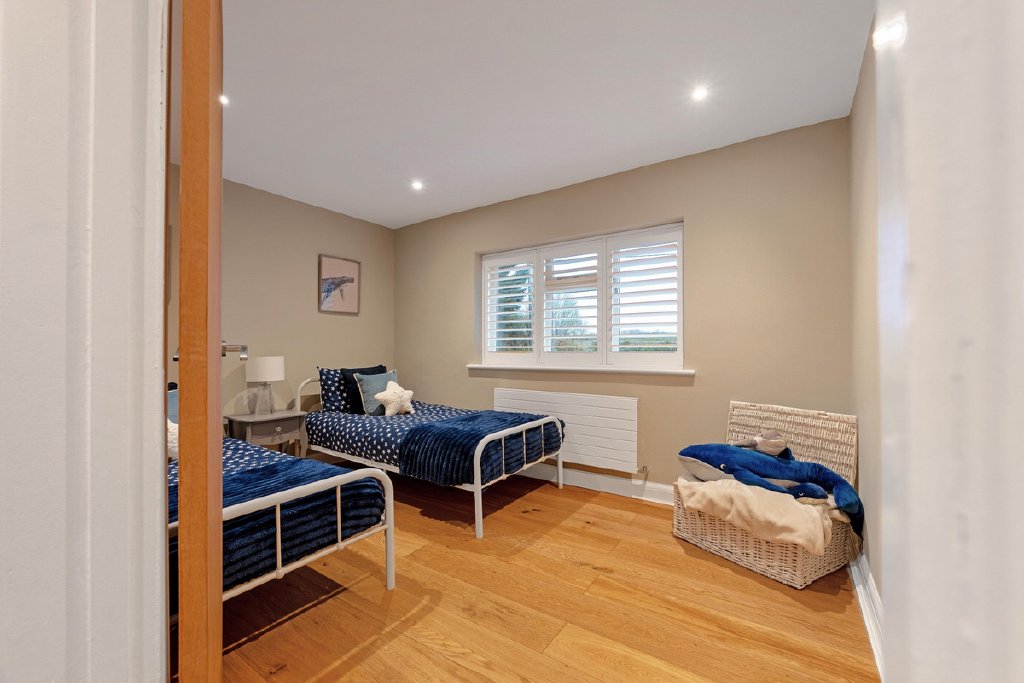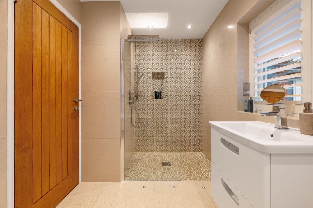 A well-proportioned guest bedroom benefits from its own en suite, while two further double bedrooms are served by a beautifully appointed family bathroom featuring a walk-in shower and statement bath. All bathrooms enjoy underfloor heating, reinforcing the sense of comfort and quality throughout.