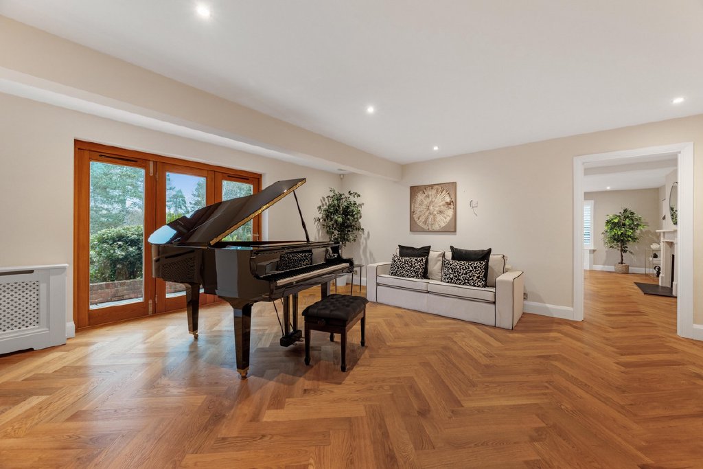 The piano room offers the same views with bi-fold doors providing access onto the terrace, allowing indoor and outdoor living to flow effortlessly during the warmer months. Whilst the family room with second feature fireplace offers a floor to ceiling glass view point to fully embrace the landscape.