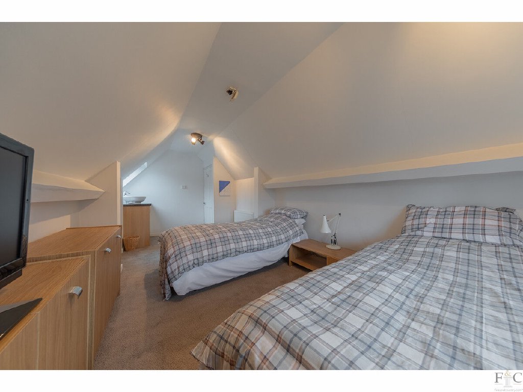A beautiful curved staircase from the first floor landing ascends to the second floor, where a spacious bedroom with wash basin awaits — ideal as a guest suite, teenage retreat, or private studio. An additional room provides further flexible accommodation, perfectly suited as a home office or study.
