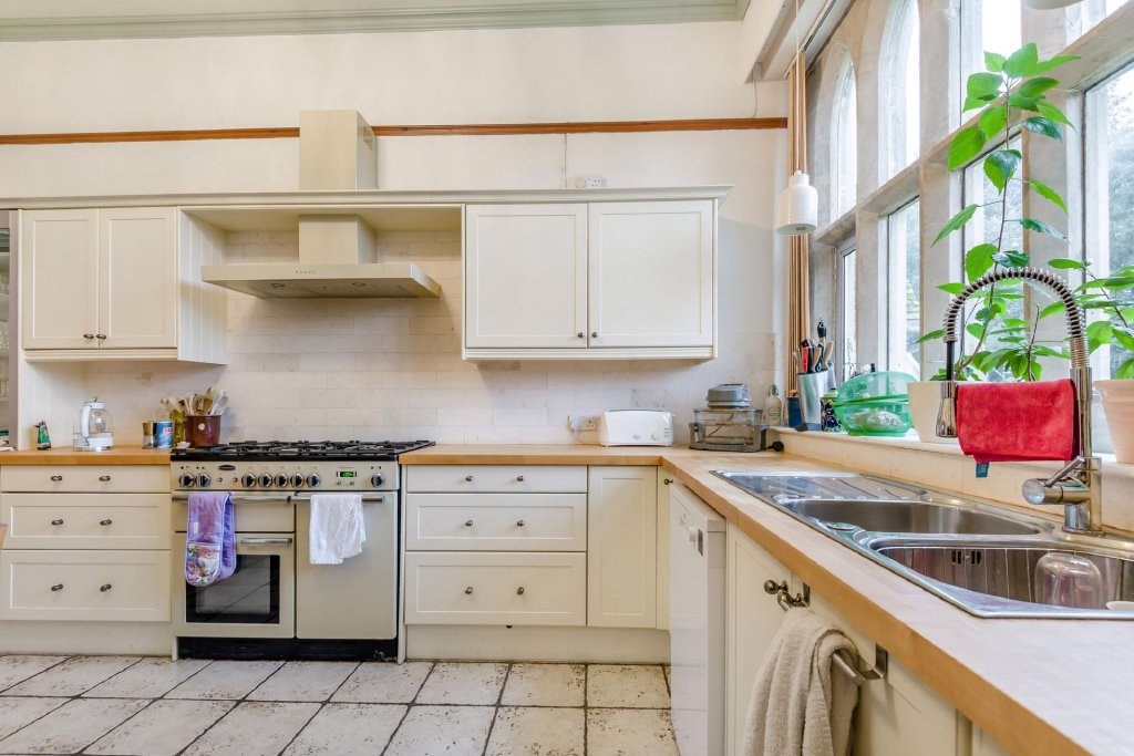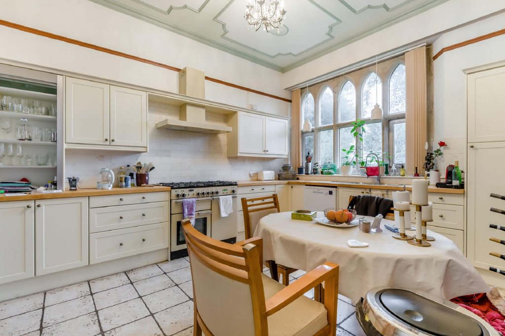 Finished in ashlar stone with Bath stone dressings and Gothic arch windows, along with a striking turret, this impressive five-bedroomed house offers plenty of space for a family home, with high ceilings, period tiles and beautiful fireplaces among its stand-out features.