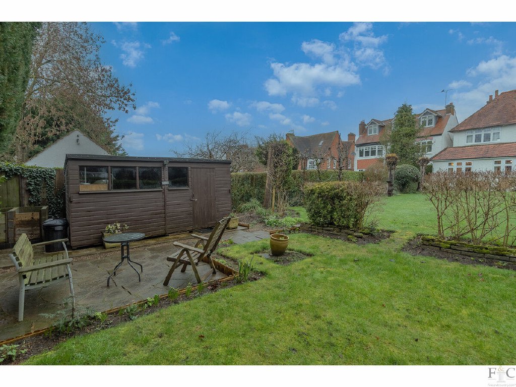 Outside, the property truly excels. The south-facing rear garden is a wonderful feature of this home — a generous, beautifully private plot with a paved patio ideal for alfresco dining and entertaining, opening onto a wide expanse of well-kept lawn. Mature trees and established shrub borders provide a naturally screened, peaceful sanctuary, creating a garden that feels wonderfully secluded and private.