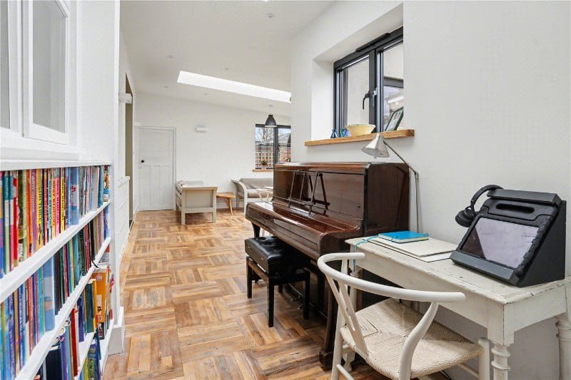 - Light filled rear extension with aluminium casement windows and sliding doors, two large skylights, oak flooring with chestnut border, built in bookcase and feature lighting.