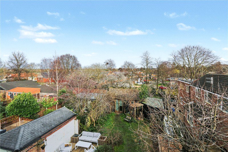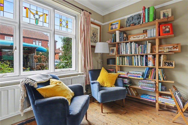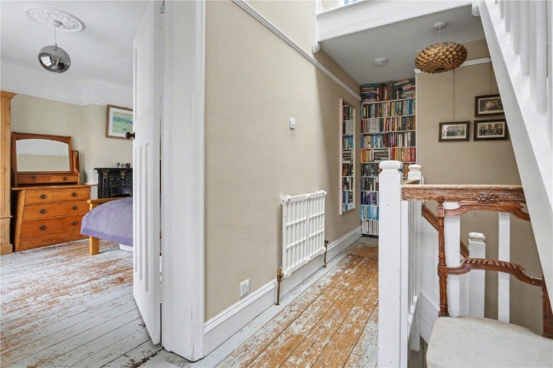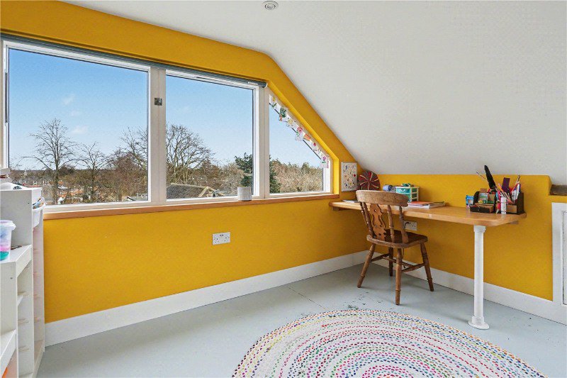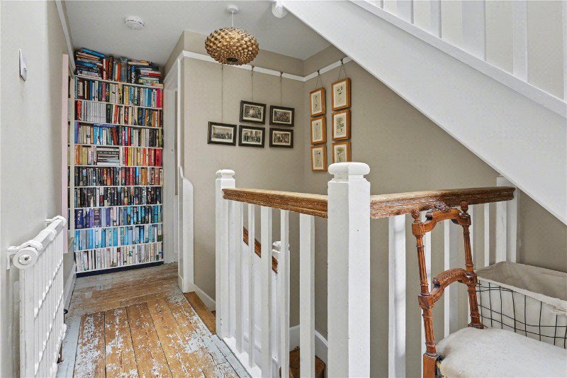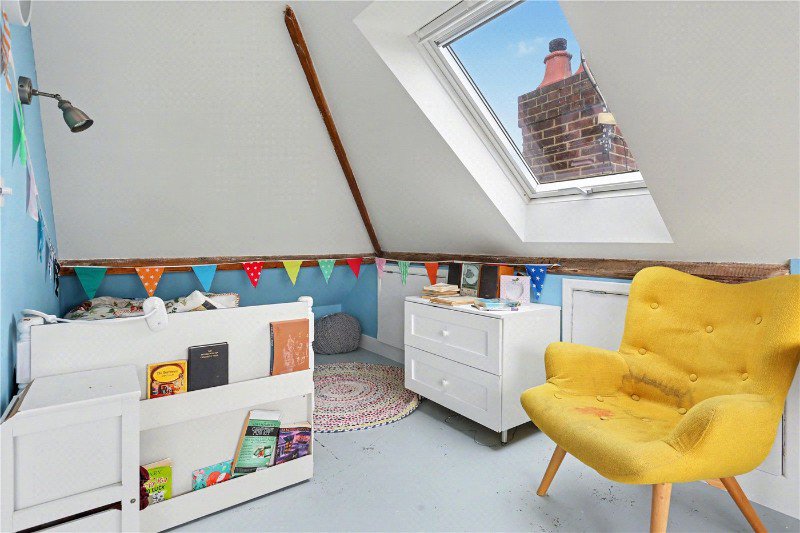 The second floor reveals two further bedrooms illuminated by Velux windows, each with access to generous eaves storage via two separate hatches. A built-in beech desk enhances functionality, while a cleverly designed secret door disguised as a bookcase adds a playful and memorable touch that perfectly reflects the individuality of this home.
