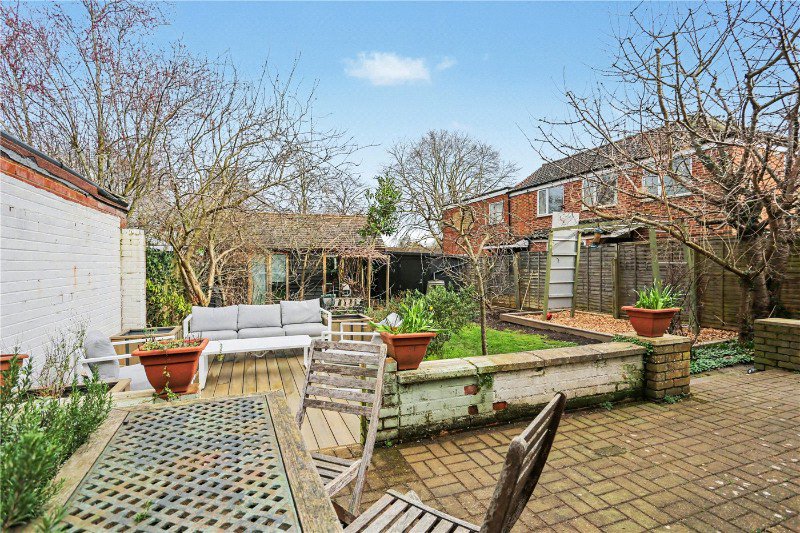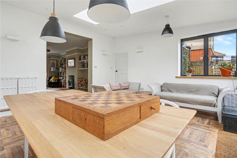 The rear extension is a triumph of light and craftsmanship. With double glazed aluminium casement windows and sliding doors, two expansive skylights, and ash window sills, this space is bathed in natural light throughout the day. Oak flooring with a chestnut border adds warmth and definition, while a built-in bookcase, wall lights and statement pendants complete the space. The garden room seamlessly connects indoor and outdoor living, opening directly onto the rear garden.