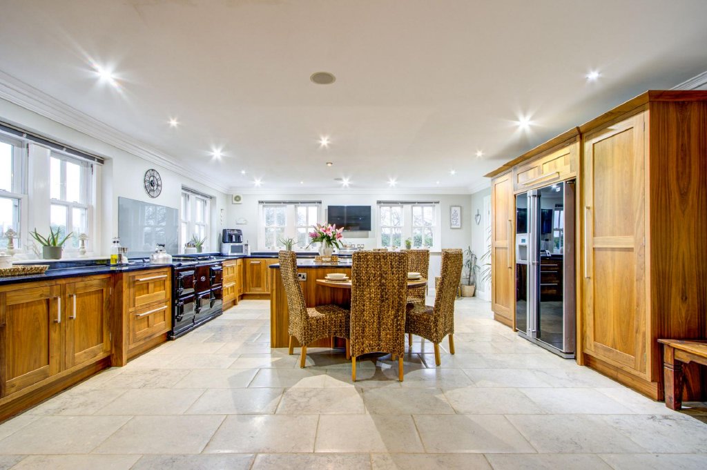 At the heart of the home lies the impressive kitchen and breakfast room. This warm and sociable hub features bespoke timber cabinetry, a central island with breakfast bar and integrated table, high specification appliances and an Aga providing both style and functionality, ideal for family living.