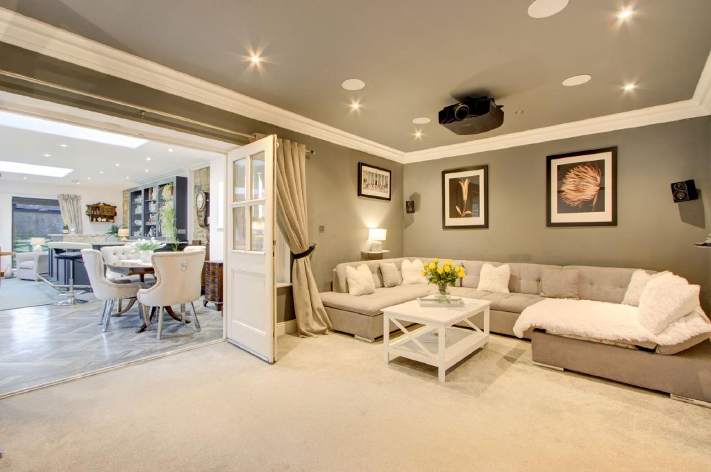 There is a natural flow from the kitchen into the cinema room, where film nights are transformed into a special event. For entertaining on a larger scale, the magnificent garden room truly delivers - complete with bar area and bi-fold doors opening onto the terrace, it’s a space designed for family get-togethers and celebration.